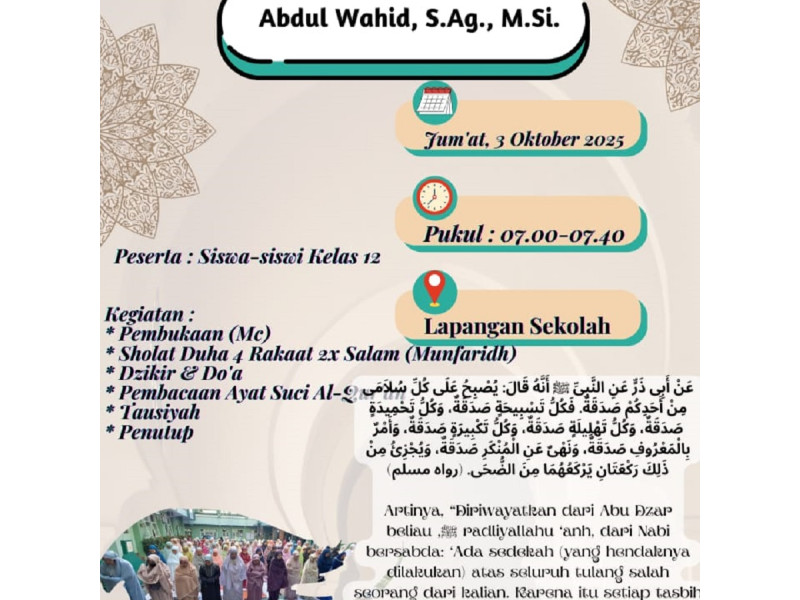 1. Pembukaan Gambar: MC oleh Viola Kirana Putri 11 MP.2 dan Lydia Rahma Aulia 10 PM.32. Shalat Dhuha Gambar: Pelaksanaan Shalat Dhuha Gambar: Pelaksanaan Shalat Dhuha3. Doa, Dzikir dan Membaca al-Qur’an Gambar: Dzikir, Doa dimpimpin oleh Muhammad Raditya Wicaksana 10 AKL.1 Gambar: Membaca al-Qur’an dimpimpin oleh Rafie Hanan Putra Setiawan 10...
