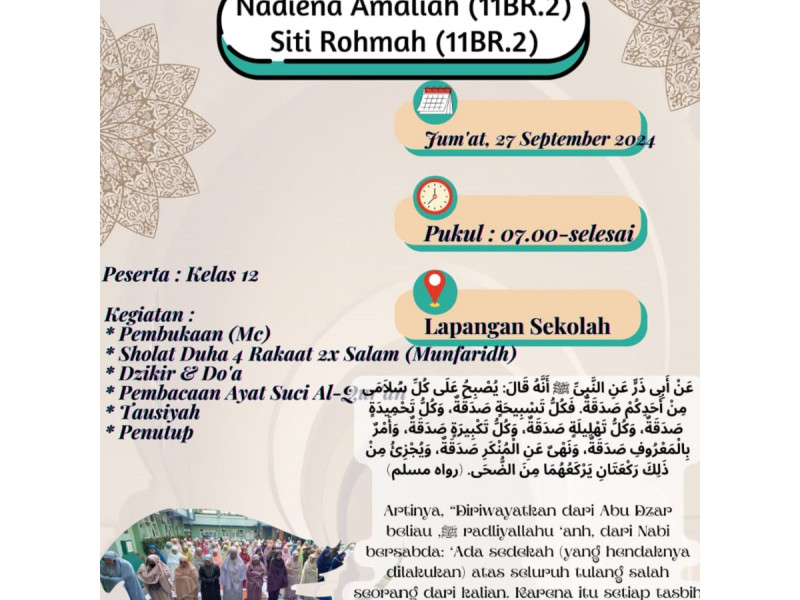 Pembukaan Gambar: Mc oleh Adinda Miranda 11-MP.1 dan Annisa 10-AKL.3 Sahalat Dhuha Gambar: Pelaksanaan Shalat Dhuha Gambar: Pelaksanaan Shalat Dhuha Doa, Dzikir dan membaca al-Qur’an Gambar: Doa, Dzikir dan membaca al-Qur’an dimpimpin oleh M. Riski Mulya 12-BR.3 Tausiyah Gambar: Tausiyah oleh Nadiena Amaliah 11-BR.2 dan Siti Rohmah 11-BR.2 Gambar: Peserta Pembiasaan Dhuha ...