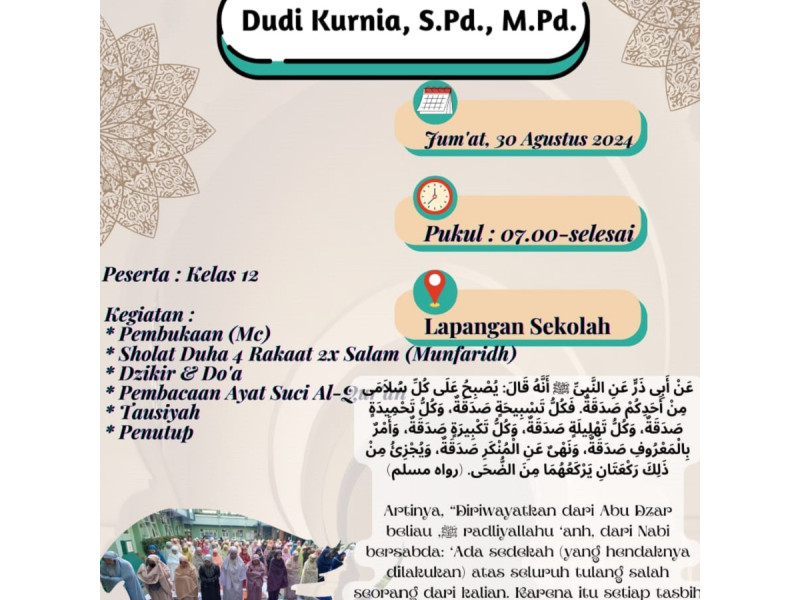Pembukaan Gambar: Mc oleh Mekha Rayyan Arsyo (11MP.3) dan Lina Nurhayati (11AKL.2) Sahalat Dhuha Gambar: Pelaksanaan Shalat Dhuha Gambar: Pelaksanaan Shalat Dhuha Doa, Dzikir dan membaca al-Qur’an Gambar: Doa, Dzikir dan membaca al-Qur’an dimpimpin oleh Bapak Dudi Kurnia, S.Pd. M.Pd. Tausiyah Gambar: Tausiyah oleh Bapak Dudi Kurnia, S.Pd. M.Pd.Gambar: Peserta Pembiasaan Dhuha Gambar: Peserta Pembiasaan Dhuha Gambar: Peserta Pembiasaan...