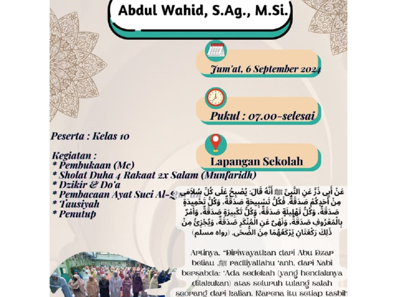 Pembukaan Gambar: Mc oleh -Tiana Lestari 11 MP.3 dan Fujia Astuti 11 BR.1 Sahalat Dhuha Gambar: Pelaksanaan Shalat Dhuha Gambar: Pelaksanaan Shalat Dhuha Gambar: Pelaksanaan Shalat Dhuha Doa, Dzikir dan membaca al-Qur’an Gambar: Doa, Dzikir dan membaca al-Qur’an dimpimpin oleh Bapak Abdul Wahid, S.Ag., M.Si. Tausiyah Gambar: Tausiyah oleh Bapak Abdul Wahid, S.Ag., M.Si. Gambar: Peserta Pembiasaan Dhuha Gambar: Peserta Pembiasaan...