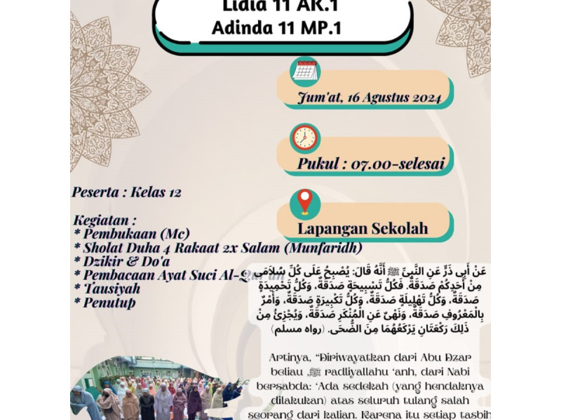 Pembukaan Gambar: Mc oleh Azka Kezia Putri (12 AK.2) dan Putri Aprilianti (12 AK.2) Sahalat Dhuha Gambar: Pelaksanaan Shalat Dhuha Gambar: Pelaksanaan Shalat Dhuha Gambar: Pelaksanaan Shalat Dhuha Doa, Dzikir dan membaca al-Qur’an Gambar: Doa, Dzikir dan membaca al-Qur’an dimpimpin oleh Bapak Fahad Abdul Manap, S.Pd. Tausiyah Gambar: Tausiyah oleh Lidia Sintia Bela (11 AK.1) dan...