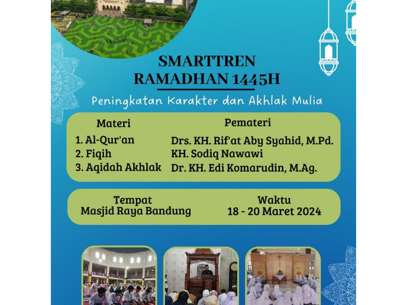 1. Pembukaan Gambar: MC oleh Bapak Dudi Kurnia, S.Pd., M.Pd. 2. Pembacaan Ayat Suci al-Qur’an Gambar: Pembacaan ayat suci al-Qu’ran oleh Siti Rohmh 3. Sambutan Kepala Sekolah Gambar: Bapak Dede Hasanudin, S.Pd., M.M.Pd. menyampaikan sambutan sekaligus membuka acara Smartren Ramadhan 1445H di Masjid Raya Bandung Jawa Barat 4. Sambutan DKM...