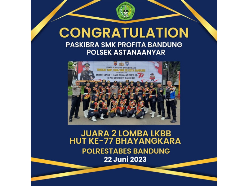 Pada tanggal 22 Juni 2023, eskul Paskibra SMK Profita Bandung dengan kepelatihan Kang Bayu Mafatih H. dan pembina ibu Yunyun yunia, S.Pd. dibawah koordinasi dan arahan Polsek Astanaanyar mengikuti ajang perlombaan LKBB (Lomba Kreatifitas Baris Berbaris) dalam rangka memperingati HUT ke-77 Bhayangkara di Polrestabes...