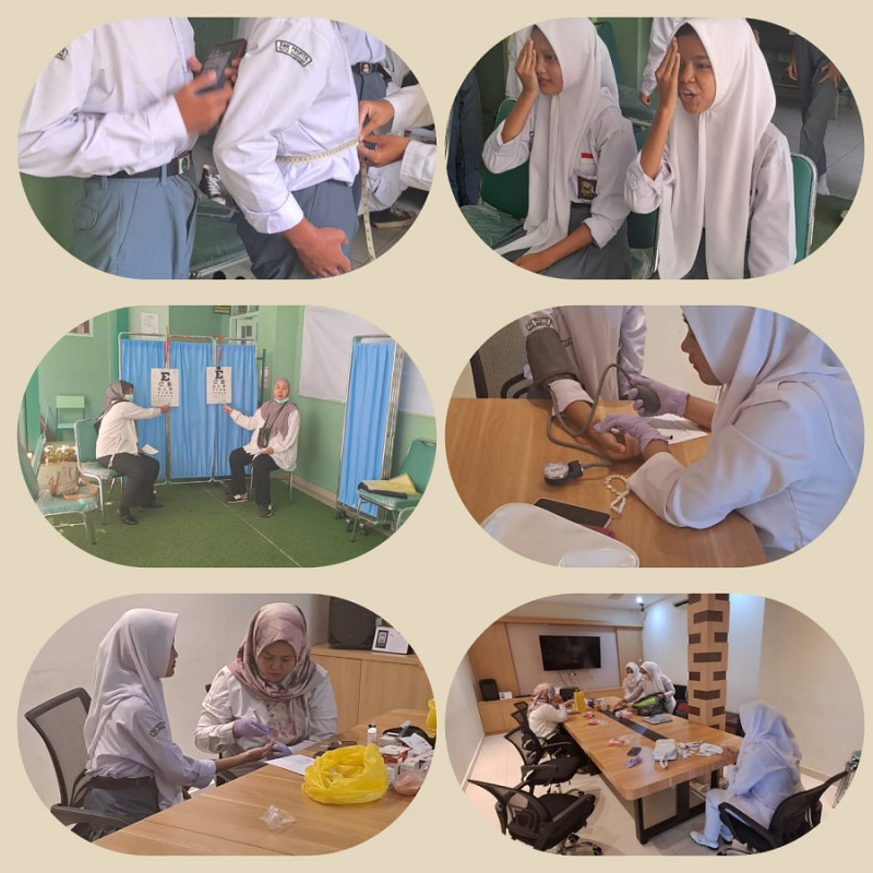 Pemeriksaan kesehatan secara fisik oleh anggota ekskul PMR SMK Profita Bandung meliputi pengukuran tinggi badan, berat badan dan lingkar pinggang. Pemeriksaan kesehatan secara fisik oleh petugas Puskesmas Pagarsih meliputi tekanan darah, pemeriksaan ketajaman penglihatan dan pemeriksaan gigi dan serta pemeriksaan gula darah.