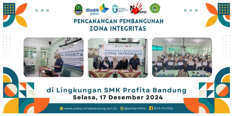 Dalam rangka Pencanangan Pembangunan Zona Integritas untuk mewujudkan Wilayah Bebas dari Korupsi (WBK) dan Wilayah Birokrasi Bersih Dan Melayani (WBBM) melalui reformasi birokrasi di Lingkungan Dinas Pendidikan Provinsi Jawa Barat, maka SMK Profita Bandung menyelenggarakan pencanangan Zona Integritas di Satuan Pendidikan pada tanggal 17 Desember 2024.
