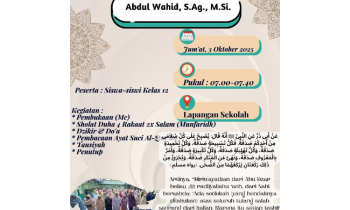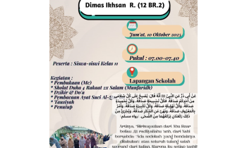 1. PembukaanGambar: MC oleh Viola Kirana Putri 11 MP.2 dan Lydia Rahma Aulia 10 PM.32. Shalat DhuhaGambar: Pelaksanaan Shalat DhuhaGambar: Pelaksanaan Shalat Dhuha3. Doa, Dzikir dan Membaca al-Qur’anGambar: Dzikir, Doa dipimpin oleh Muhammad Raditya Wicaksana 10 AKL.1Gambar: Membaca al-Qur’an dipimpin...
